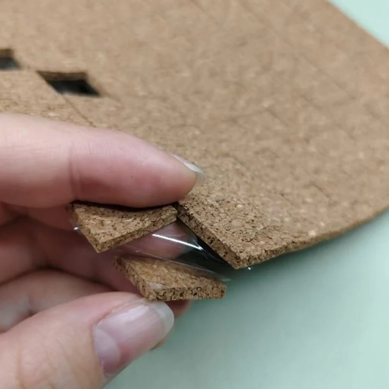 1/8" x 3/4" x 3/4" Cork Shipping Pads na may Cling Backing, na pangunahing binubuo ng cork at naaalis na pandikit, at papel o transparent na PET bilang liner sa likod, na nakaimpake sa kahon sa anyo ng mga sheet o roll, tulad ng ipinapakita sa ibaba: